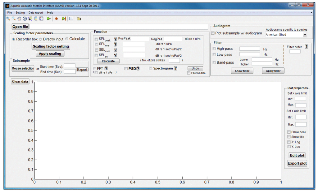 The purpose of this study was to build a program controlled by an easy-to-use graphical user interface (GUI) that could be used to efficiently post-process underwater sound files recorded by the USRs and other devices. In addition to the features mentioned so far, the Aquatic Acoustic Metrics Interface (AAMI) was designed to implement some of the same sound file editing functions found in other commercial software, as well as offer unique features unavailable in other programs.