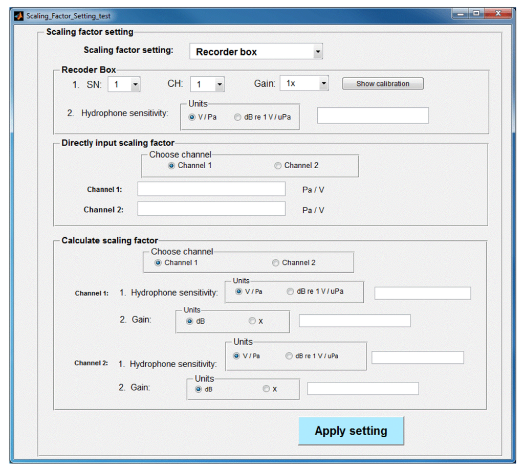 The Calculate scaling factor setting can be used for audio files obtained from any USR. Two parameters need to be specified: the hydrophone sensitivity in dB or V/Pa units and the receiver gain, entered in dB or x (times) units.