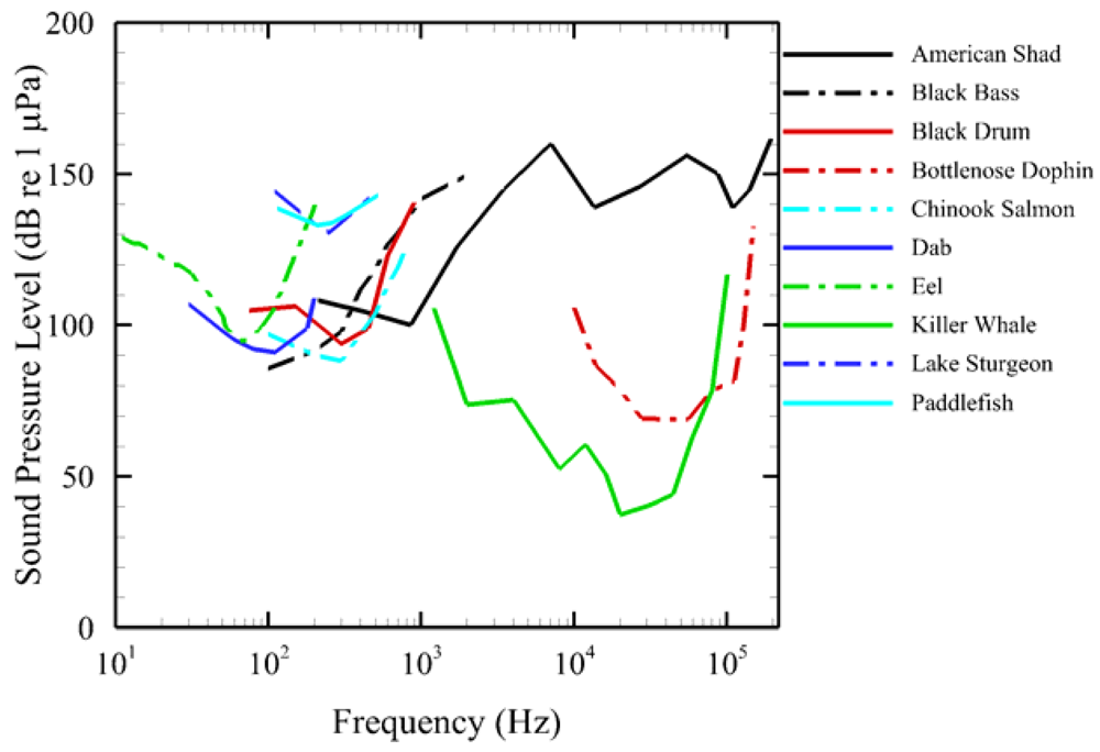 An audiogram is a standard way of presenting an animal's hearing sensitivity in functional form as a variable threshold over a frequency range. Currently, AAMI contains a library of audiograms (Figure 3) for a number of fish and marine mammal species: American shad [20], black bass [21], black drum [22], bottlenose dolphin [23], Chinook salmon [24], eel [25], dab [26], lake sturgeon and paddlefish [27], killer whale [28]. We selected these audiograms from existing literature and did not evaluate their quality independently. Additional audiograms may be entered when they become available.