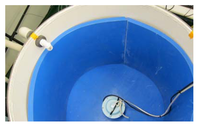 In our response tests, salmon were exposed to simulated tidal turbine noise continuously for 24 h around a SPLrms of 159 dB re 1 µPa to measure the effects on their hearing and tissues. That level corresponded to the source level of a prototype turbine, estimated from measurements of an operating turbine [34]. After exposure to the noise, fish were assessed at four different times for tissue damage and for changes in hearing sensitivity. The noise exposure test tank was a 500-L round aluminum tank lined with a blue anechoic material (Aptflex F48, Precision Acoustics Ltd., Dorchester, UK) to stiffen the walls and create a uniform sound field (Figure 4). A UW30 speaker (Lubell Labs Inc., Columbus, OH, USA) was placed in the center of the tank's bottom, connected to a Sony PCM-D50 recorder that played back simulated tidal turbine noise. A hydrophone (Model TC4013, Reson, Inc. Goleta, CA, USA; sensitivity −211 dB re 1 V/µPa) was positioned in the center of the water in the tank at a depth of approximately 30 cm. This placement of the hydrophone permitted measurement of the sound to which test fish were exposed. The hydrophone was calibrated by the manufacturers for the frequency range of 250 Hz to its usable frequency ranges. It was also recalibrated in PNN's in-house A2LA accredited underwater acoustic facility [35].