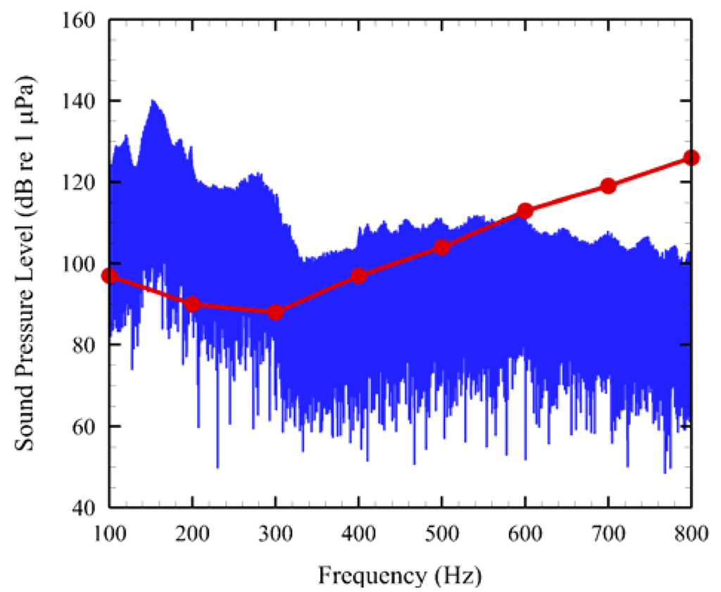 One of AAMI's unique features was also applied to a 1-min sound sample (Figure 7). An audiogram derived from the evoked auditory potential (AEP) of a juvenile Chinook salmon [24] was overlaid on the noise sample. The red trace is the audiogram. Regions in which the red line is below or covered by the blue noise signal clearly show which auditory frequencies that would most likely be affected by tidal turbine noise (e.g., 100–500 Hz).