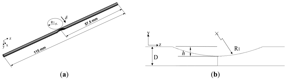 As shown in Table 1, the yield stress of the core material (PMMA) is equal to 56 MPa. In other words, the FE results imply that the core material undergoes elastic deformation only at the maximum disc displacement of δ = 10 mm irrespective of the bend radius applied. In addition, Figure 5 shows that the length of the deformation region in the grooved POFs, i.e., length , is approximately the same in every case.