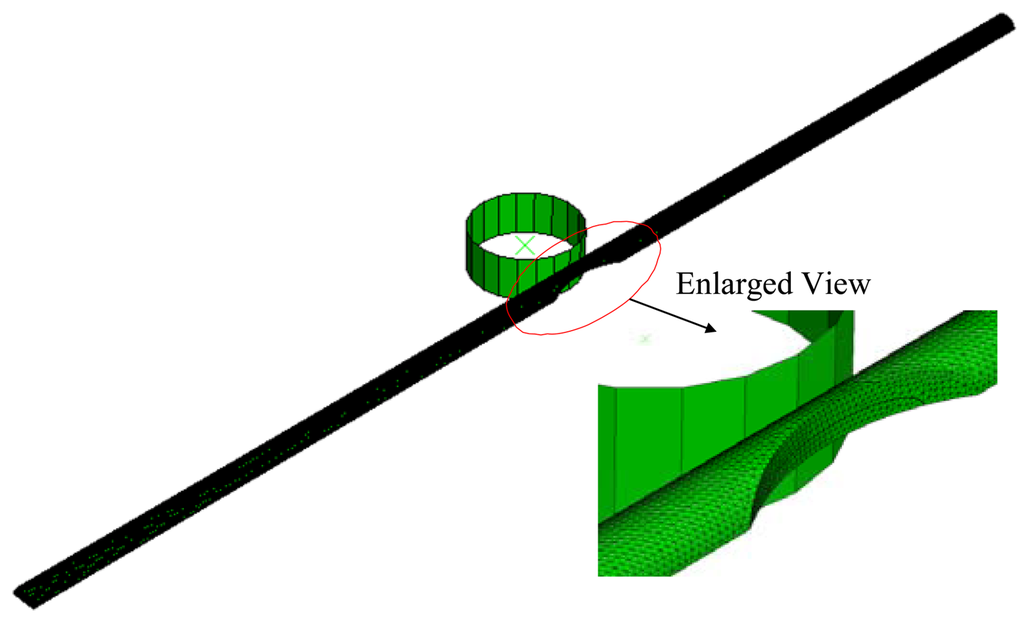 In this study, an elastic-plastic finite element model is employed to evaluate the deformation and stress distributions in the core diameter as the POF specimen is subjected to bent and elongated deformation. The simulations are performed using the commercial finite element package ABAQUS. The finite element mesh of the tested POF specimen is shown in Figure 3.