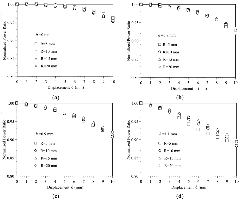 Figure 4 plots the variation of the normalized power ratio η̄ with the bending displacement δ as a function of the bend radius R given groove depths of h = 0, 0.7, 0.9 and 1.1 mm, respectively. It is seen that for all values of the groove depth, the power loss increases with an increasing bending displacement. The power loss is particularly significant in the specimens with a greater groove depth. As shown in Figure 4(a,d), for a displacement of δ = 10 mm, the normalized power ratios η̄ for groove depths of h = 0.0 and 1.1 mm are 0.96 and 0.88, respectively. The corresponding power losses are 0.04ηo and 0.12ηo, respectively. The sensitivity can be determined as 0.004 ηo/mm and 0.012 ηo/mm for groove depths of h = 0.0 and 1.1 mm, respectively. The results show that the sensitivity of the device can be improved significantly by increasing the groove depth. However, for a given groove depth, the variation of the power loss with the displacement is insensitive to the bend radius.