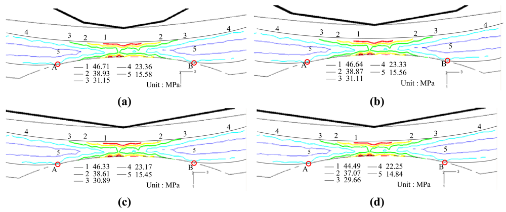 Figure 5 presents the FE simulation results for the von Mises stress distribution near the grooved region of the POF specimens deformed using various disc radii (note that the groove depth is 1.1 mm and the disc displacement is δ = 10 mm in every case). Comparing the four figures, it is seen that the disc radius has only a small effect on the von Mises stress distribution. From inspection, the maximum von Mises stress is found to be 46.71, 46.64, 46.33 and 44.49 MPa given disc radii of R = 5, 10, 15 and 20 mm, respectively.