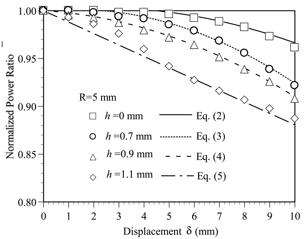 Applying a nonlinear least squares fitting procedure to the experimental data shown in Figure 6, it is found that the normalized power ratio η̄ for different values of the groove depth can be formulated in terms of the bending displacement δ as follows: