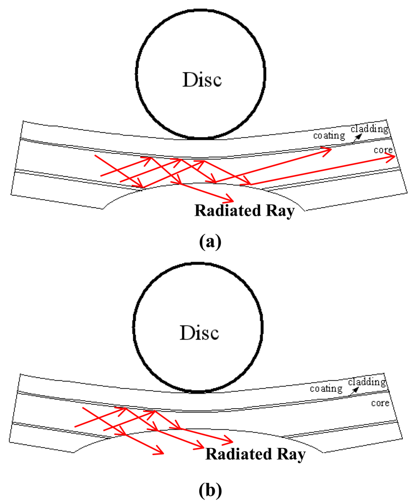 Figure 6 shows the variation of the normalized power ratio η̄ with the bending displacement δ given various values of the groove depth h. Note that the symbols shown in Figure 6 represent the experimental results, while the dashed and solid lines represent the results obtained using the empirical model presented below. Note also that the results correspond to a disc radius of R = 5 mm in every case. It is seen that the normalized power ratio η̄ decreases, i.e., the power loss increases, as the bending displacement increases. Moreover, for a constant bending displacement, the power loss increases significantly with an increasing groove depth. From inspection, the normalized power ratio at the maximum displacement of δ = 10 mm is found to be 0.96, 0.92, 0.90 and 0.88 given groove depths of h = 0.0, 0.7, 0.9 and 1.1 mm, respectively. In other words, the power loss reaches a maximum value of 12% given a bending displacement of δ = 10 mm and a groove depth of h = 1.1 mm. Figure 7(a,b) illustrates the ray paths within the core of the deformed POF specimens with a groove depth of h = 0.9 and h = 1.1 mm, respectively. Note that the incident angles of the rays shown in Figure 7 are assumed to be 70°, i.e., the critical angle of the undeformed POF. The reduction in the incident angle caused by grooving and the subsequent exposure of the core to the air causes some of the rays to be refracted through the core. As a result, a power loss is induced. From Figure 7(a,b), it can be observed that Figure 7(b) has a larger deformed groove depth. Thus, the number of rays refracted through the core/air boundary increases. This results in the increase of power loss.