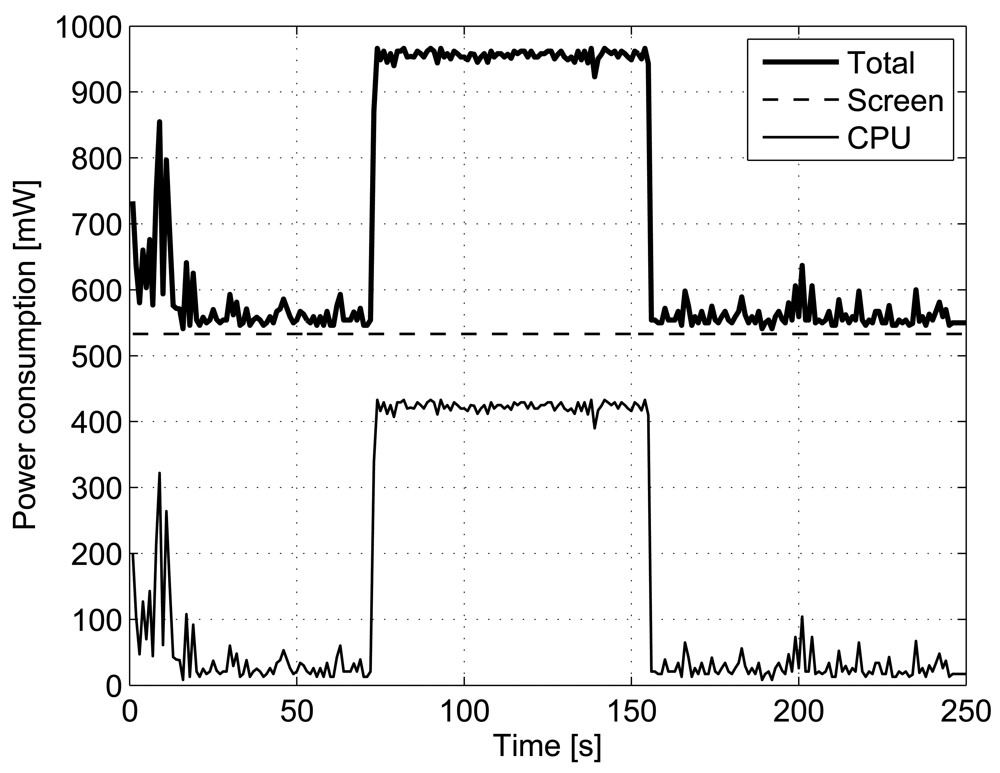 Finally, the last resource to be analyzed is the power consumption derived from the algorithm execution in the terminal. In order to measure that, we have used the PowerTutor tool for Android phones ( http://ziyang.eecs.umich.edu/projects/powertutor/). Using the same setup explained before, the 4 days trace was processed. Figure 10 shows the power consumption incurred during the period of execution of the prediction algorithm. Although the entire trace is processed continuously for this test, in the actual scenario this power consumption would be extended along the 4 days, i.e., the algorithm is executed only when a new cell change happens, thus the power consumed by the CPU, which is around 400 mW, is bounded to the few miliseconds of processing for each cell change.