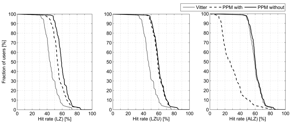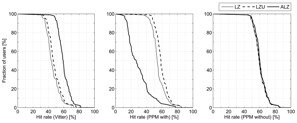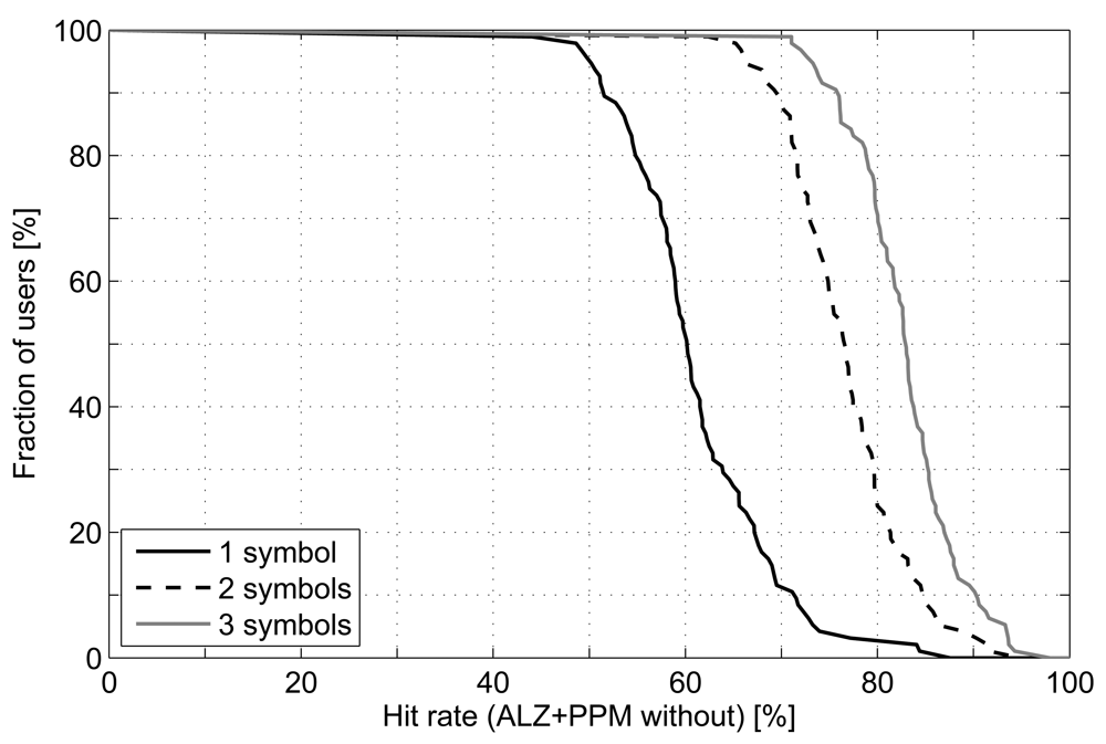 Figure 11 shows the results of applying this measurement over the predictions made with Active LeZi combined with PPM without exclusion. We can see a remarkable increase of hit rate when using two symbols, such that around 90% people attain at least a hit rate of 70%. The use of three symbols also improves the performance, but with less differences. An explanation for this result is that a trace gathers every cell change: the ones caused by user movement and those produced by detecting better signal from another base station when user is not moving. This last event is usually observed in traces as frequent changes between two or three cells, although this set of cells should be considered as an only one. Using more symbols as predictions is like clustering cells, and may be one of the reasons why hit rate improves so much.