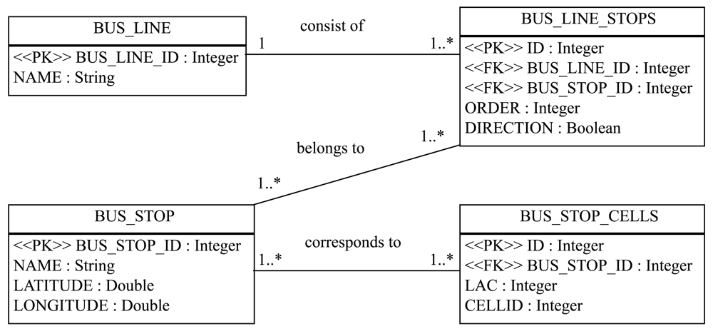One of the advantages of this system is that the mobility tracking is made without using the GPS. Instead, the GSM approach explained in Section 2 has been followed to track users' mobility. The bus lines data could be accessed by making requests to some web service or REST API, but in this case we have saved the information into a database on the mobile phone itself in order to avoid Internet connections, which means energy consumption, third party dependence and extra response delay.
