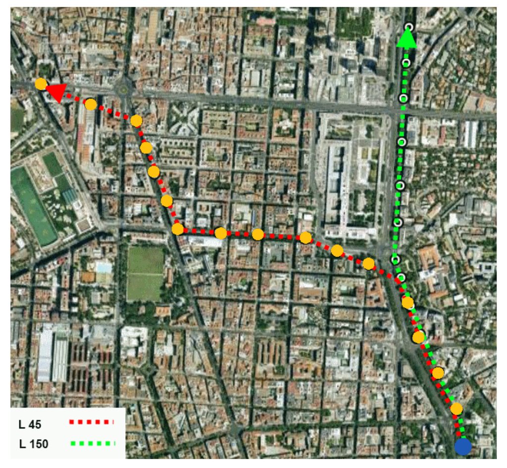 In order to check the recommender system, the following test was performed. The scenario shown in Figure 14 was built, which consists of two bus lines from EMT, lines 150 and 45. They were chosen because of two reasons: