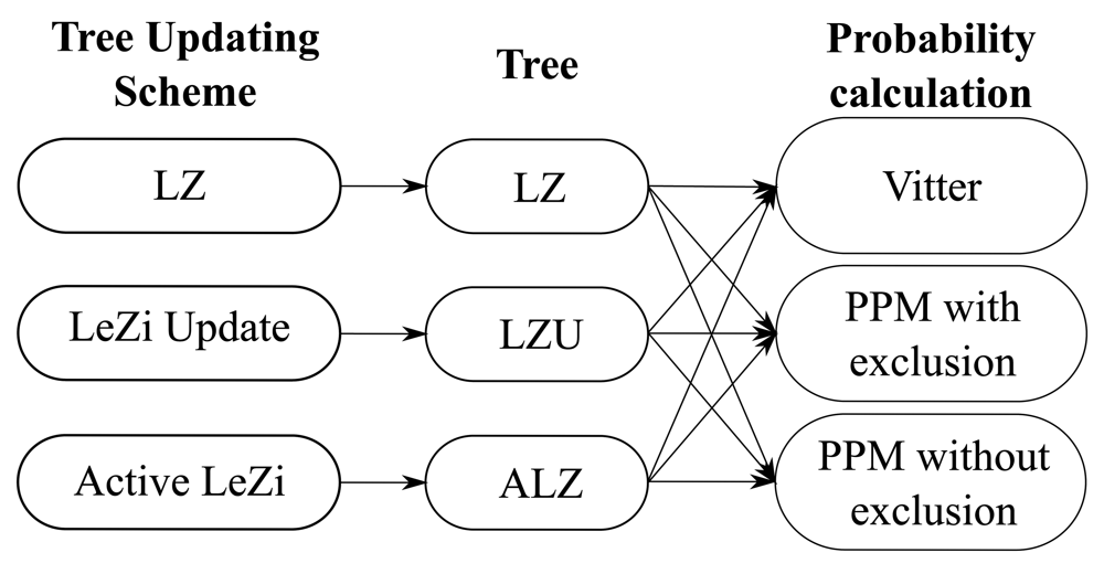 - Cleary, J.G.; Teahan, W.J. Unbounded length contexts for PPM. Comput. J. 1997, 40, 67–75. [Google Scholar]