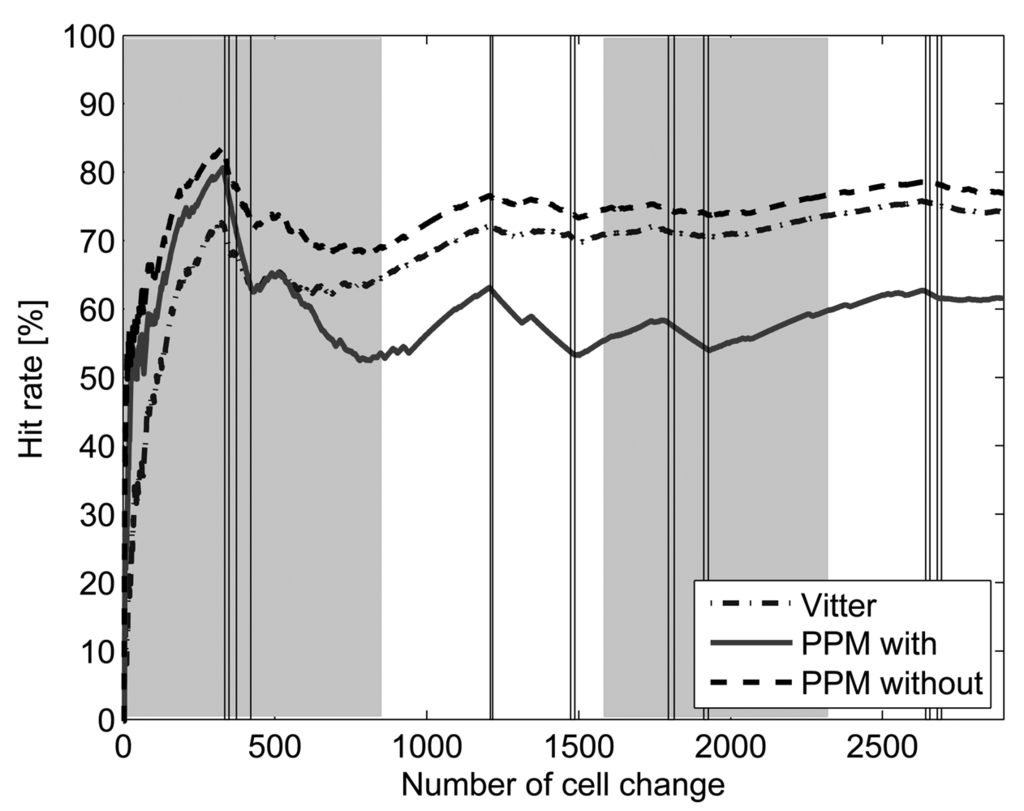 Regarding the temporal evolution of the hit rate, Figure 4 shows this evolution for the 4 days trace. Grey and white zones delimit each day. The vertical lines within each day point out when the user leaves home to go to her job, gets there, leaves the work place and arrives home. As it can be observed, the first day the hit rate is very variable since the algorithms are learning the user's routines for the first time. For the rest of the days, the hit rate increases while the user is at home (the only cell changes are due to network issues and usually there are only two or three different cells to which the cell phone switches even when there is no movement associated), whilst the hit rate decreases slightly when the user is away. It has to be taken into account that, although the route between home and work place is always the same, the series of BSs representing that route (the series of BSs the user is attached to during the trip) can be different and are not under the user's control. Therefore, the pattern learned the first day might be different from that of the second day. As time goes by and all possible BSs series representing that route are learned by the algorithms, the hit rate is less affected by these trips, as can be observed during the fourth day.