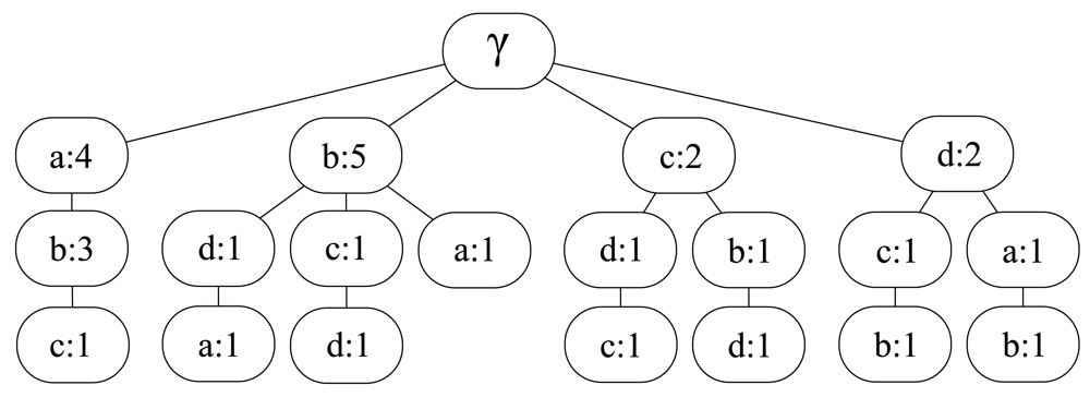 After updating the tree, the next step is to calculate the probability for each known symbol to be the corresponding to the next location. In order to do that, LZ algorithm uses an approach proposed by Vitter [30] that can be expressed as in Equation (1):
