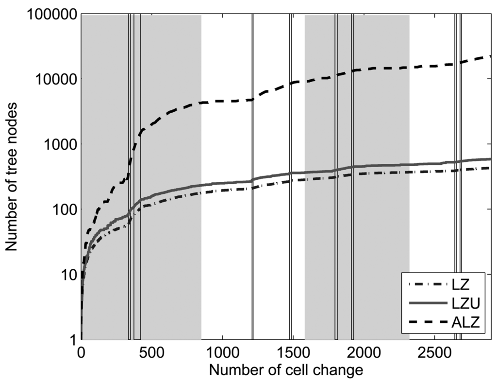 Figure 7 represents the node count evolution of each tree as each symbol of the 4 days trace is processed. The figure highlights that ALZ tree grows much faster, whereas LZ and LZU tree sizes also start growing quickly but stop increasing so fast at a lower level, achieving a size of two magnitude orders lower than ALZ tree in the end. This result proves our hypothesis that Active LeZi scheme achieves the best hit rate in most cases at the expense of much higher memory consumption, which may be unacceptable for some applications. Regarding the temporal evolution, we can see that the node count increases faster when the hit rate decrease is steeper, which reinforces the idea of the algorithms learning new patterns and thus being unable to make correct predictions.