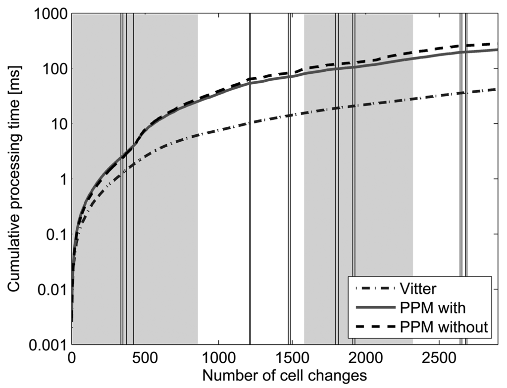 With respect to processing time, Figure 8 shows the evolution of the cumulative time spent by Active LeZi combined with each of the probability calculation methods when processing the symbols of the trace analyzed before. It is worth to notice that these are not the times spent for processing each symbol, but each value corresponds to the sum of the previous processing times plus the current one. We have chosen this representation in order to make the comparison among the three probability calculation methods more clear. The instantaneous processing time values are very variable because the prediction task is not the only one executing in the system and the existence of other delay sources makes the processing time a very variable signal. Representing the cumulative value filters the noisy appearance and highlights the differences among the different techniques. These results have been obtained with an Intel Core 2 Duo 2.66 GHz with 4 GB 1,067 MHz DDR3 computer. We can see that whereas Vitter method keeps time processing level very low all the time (it does not achieve 50 milliseconds after processing 2,900 symbols), PPM methods spend a cumulative time around 300 milliseconds in the end, one magnitude order above Vitter case. Therefore, if applications using these algorithms are time sensitive, Vitter method would be more convenient even having lower hit rate.