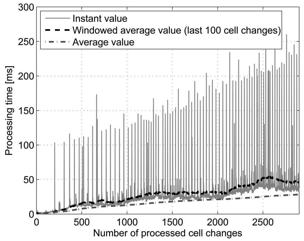 The previous figure gives just a glimpse of the differences between the processing time of the algorithms. However, it is also interesting to know the time it takes for a mobile phone to process each symbol (cell) as the time goes by and new cells are visited by the user. Figure 9 shows the time spent by a smartphone to process and generate a prediction for each new cell in every cell change in the 4 days trace. The smartphone used for the measurement is an HTC Hero with Android version 2.1-update 1. The test was driven with full battery, without connecting the terminal via USB to the computer, WiFi and GPS disabled, no SIM inserted, no other applications running and screen bright dimmed, in order to isolate the execution of the algorithms as much as possible. The 4 days trace was loaded into the device, and a simple application that takes one symbol (cell) at a time and executes the Active LeZi+PPM without exclusion algorithm was run over the entire trace. The algorithm selected represents the worst case in terms of resource consumption, since it uses the biggest tree and the probability calculation method that takes more time to estimate the next location, as shown before. In the figure we can see the instantaneous time spent for processing each new cell and estimate the next location, the running average of the process and the average made over the last 100 cell changes. Both averages smooth the peaks that can be seen at intervals that can be caused by external factors to the prediction process (e.g., operating system procedures, network operations…). As it can be seen, at the end of the trace, it takes around 50 milliseconds to make a prediction on the device.