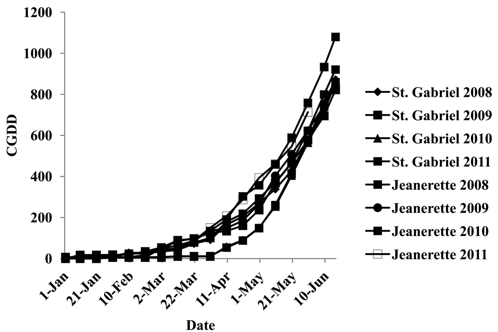 CGDD = the cumulative growing degree days from the beginning of the calendar year.