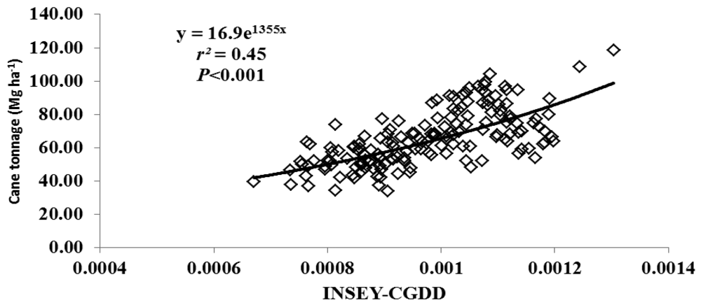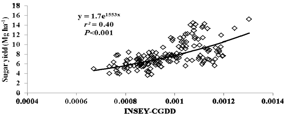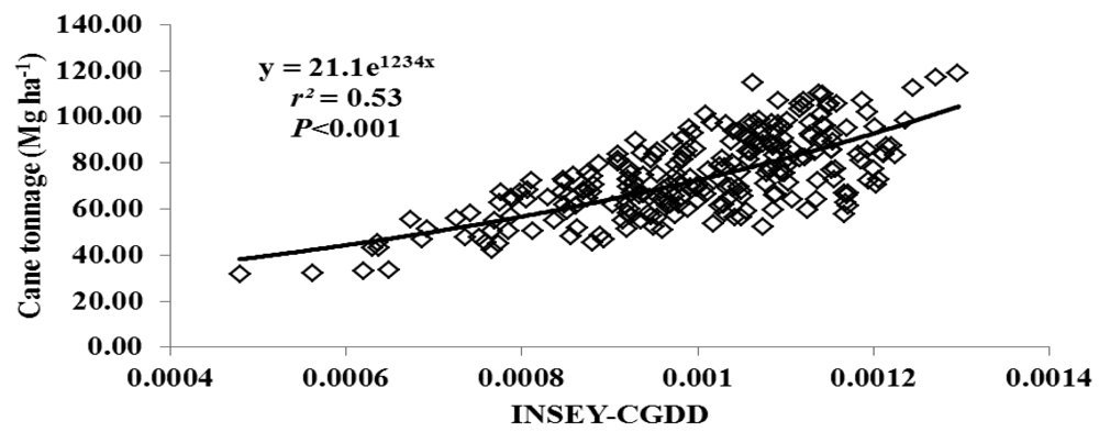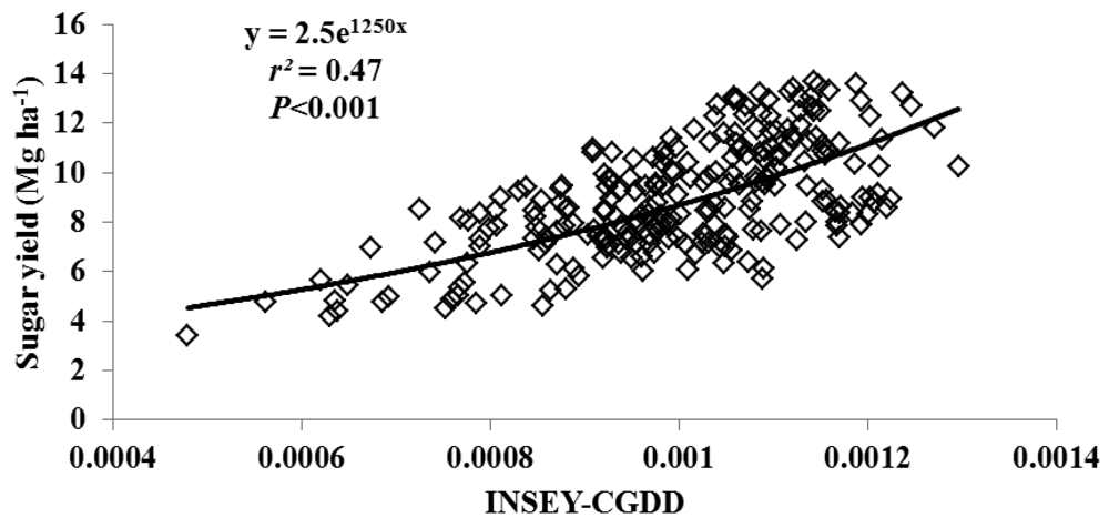 It has been documented that temperature significantly affects canopy development in sugarcane production [39–42]. Inman-Bamber [39] reported that moisture did not significantly impact early canopy development and only influenced the number of green leaves per stalk and final leaf area under water stressed conditions. Although INSEY-DFY was found to improve the YP estimation, especially for sugar yield, INSEY-CGDD obtained more consistent improvement across different growing conditions for both cane tonnage and sugar yield. This is because CGDD is a measure of cumulative temperature across the growing season and NDVI is a measure of crop greenness and biomass. Therefore, in highly variable conditions associated with sugarcane production in the mid-South, INSEY-CGDD adjustment would increase the stability of sugarcane yield prediction models utilized across different locations and years.