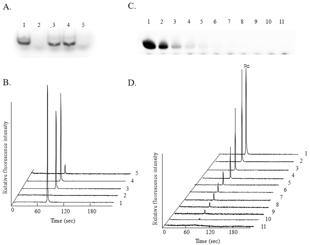 miRNA analysis using 10 ng of Cy3-miR-222 riboprobe and 10 ng of the sense riboprobe for the conventional method using polyacrylamide gel was performed (Figure 2(A)). A single band corresponding to the Cy3-miR-222 riboprobe was observed (Figure 2(A), lane 1), and this band disappeared by RNase treatment (Figure 2(A), lane 2). By the hybridization of the Cy3-miR-222 riboprobe with the miR-222 sense riboprobe, single bands corresponding to the hybridized RNA fragment (double-stranded RNA) were observed with or without RNase treatment (Figure 2(A), lane 3 and 4). The band disappeared completely in the presence of 100 ng of non-labeled miR-222 as a competitor (Figure 2(A), lane 5). Cy3 was employed for antisense riboprobe labeling for use in the conventional gel electrophoresis, because we employed the BioRad Phoros FX system for gel scanning (excitation at 532 nm and measurement of fluorescence at 588 nm). miRNA analysis using 10 ng of the Cy5-miR-222 riboprobe and 10 ng of miR-222 sense riboprobe was then performed by using microchip electrophoresis (Figure 2(B)). A single peak corresponding to the Cy5-miR-222 riboprobe was observed (trace 1), and this peak completely disappeared by RNase treatment (trace 2). By the hybridization of the Cy5-miR-222 riboprobe with miR-222 sense riboprobe, single peaks corresponding to the hybridized RNA fragment and with similar fluorescent intensity were observed in the presence (trace 3) or absence (trace 4) of RNase. These results clearly indicate that protection of the double-stranded RNA from RNase digestion occurred when microchip electrophoresis using the Cy5-miR-222 riboprobe was performed, as in the case of the conventional RNase protection assay using the Cy3-miR-222 riboprobe for the analysis of miRNA. The peak corresponding to the Cy5-miR-222 riboprobe was observed at 79 s (trace 1), and single peaks corresponding to the hybridized RNA were observed at 81 s (trace 3 to 5). This difference in the migration time must be due to the slower migration of the double-stranded RNA fragment than that of the single-stranded one. In the presence of 100 ng of a competitor, the fluorescence intensity of the peak corresponding to the hybridized RNA was apparently lower than that in the absence of the competitor (trace 5). Although signal intensity corresponding to the hybridized RNA was hardly detectable by using the same amount of competitor for polyacrylamide gel electrophoresis (Figure 2(A), lane 5), significant fluorescent intensity could be detected by the microchip electrophoresis.