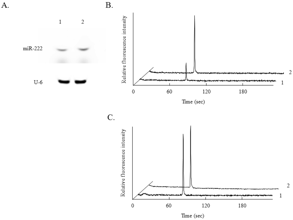 For the RNase protection assay using microchip electrophoresis, the protected RNA samples with Cy5-miR-222 riboprobe or Cy5-U6 riboprobes in 10 μL of sample buffer were denatured as described above, and then subjected to microchip electrophoresis on the Hitachi SV1210 (Hitachi-Technologies Co., Ltd. Tokyo, Japan).