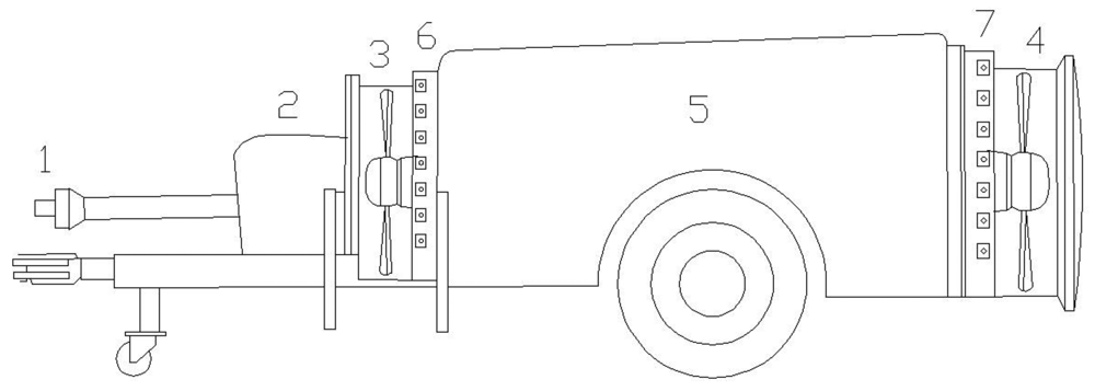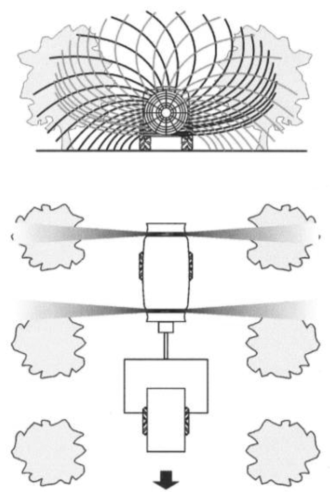 The fan placed in the front part of the tank takes the air ahead and directs it in a radial form towards the trees, whereas the back fan takes the air behind. As it is shown in Figure 2, the rotation sense of both fans is opposite. The objective of this design is to achieve a similar air flow on the left and right sides of the treated rows.