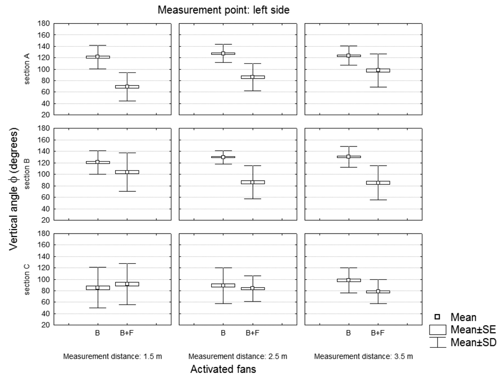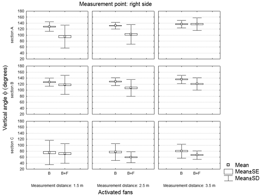 The air flow characteristics were also studied by analyzing the vertical angle φ of the velocity vector expressed in polar coordinates (Figure 10). Figures 11 and 12 show the variation of the vertical angle values according to the working side analyzed (left or right), the number of active fans and the location of the measuring point.