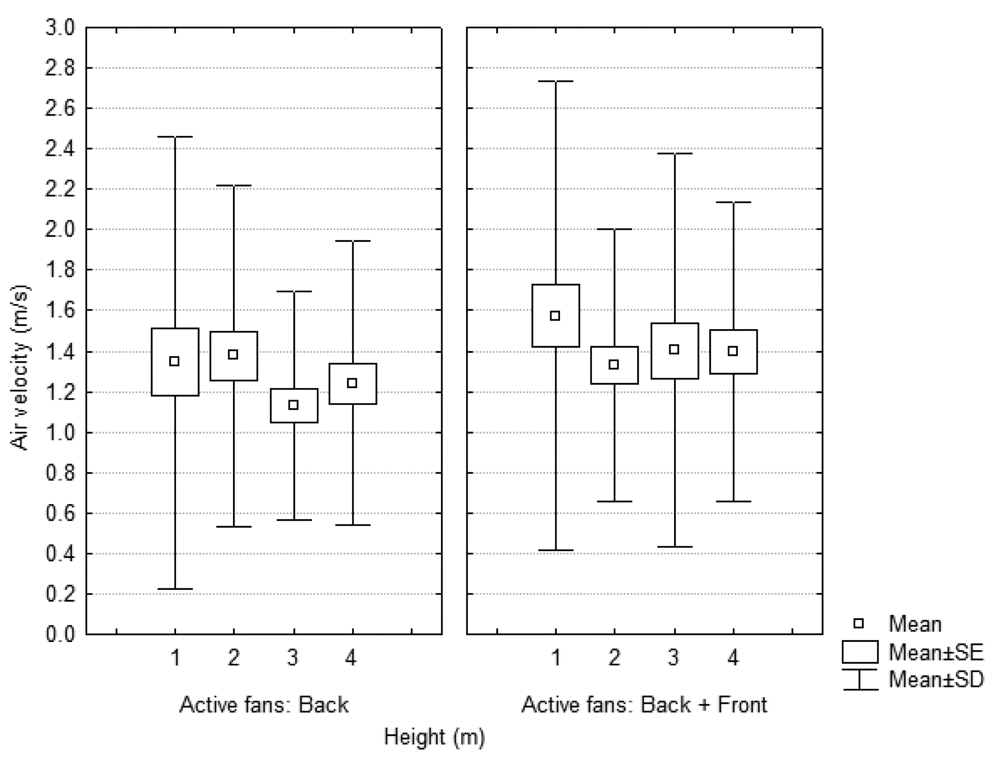 A dynamic test was developed to analyze the air flow pattern under field conditions. The measurement point was set at a distance of 2.5 m and the fan blades of the sprayer were set in position 3 with the goal of validating the static test results. The effect of the number of active fans (back, back+front) on the air velocity was analyzed by developing a univariate test of significance (Figure 13). In this sense, the number of active fans did not affect the air velocity significantly. This fact was predictable because the range of air velocities obtained with a single fan (back) was similar to that obtained with two (back+front) considering that the measuring point was located in a unique section where the total range of wind values were registered (in comparison with the static test where the differences between air values in the measurement sections varied according to the number of activated fans). Besides, the air velocity decreased significantly with the height of the measurement point.