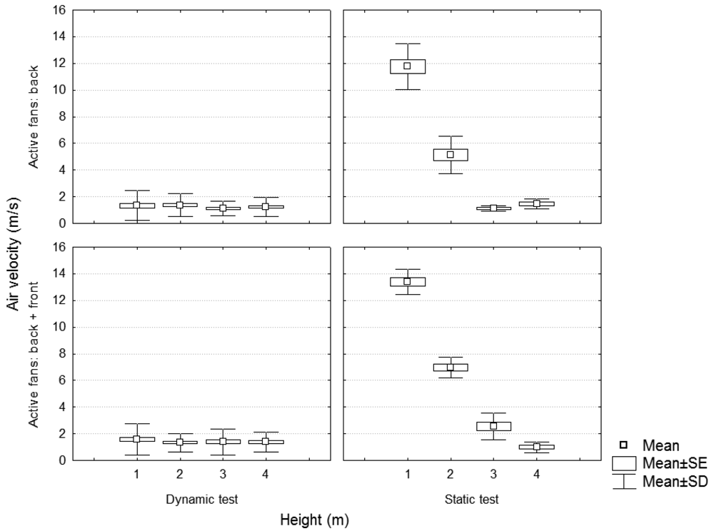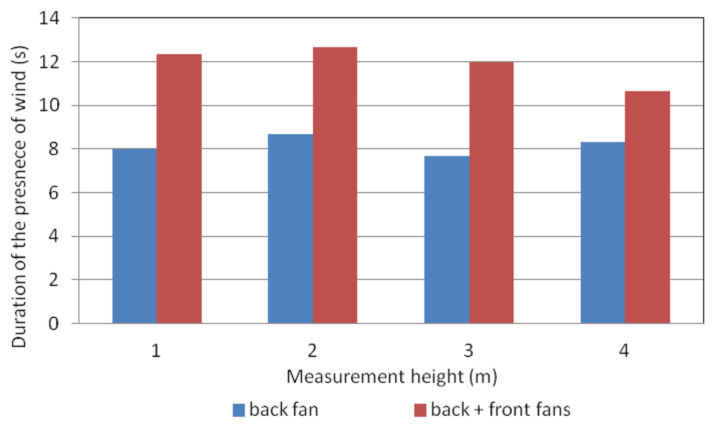 Considering the dynamic test, the use of one fan (back) or two fans (back and front) produces significant differences in the duration of the presence of wind at the measurement point and on the direction of the air velocity vector. The module of the air velocity vector is not affected by the number of activated fans.
