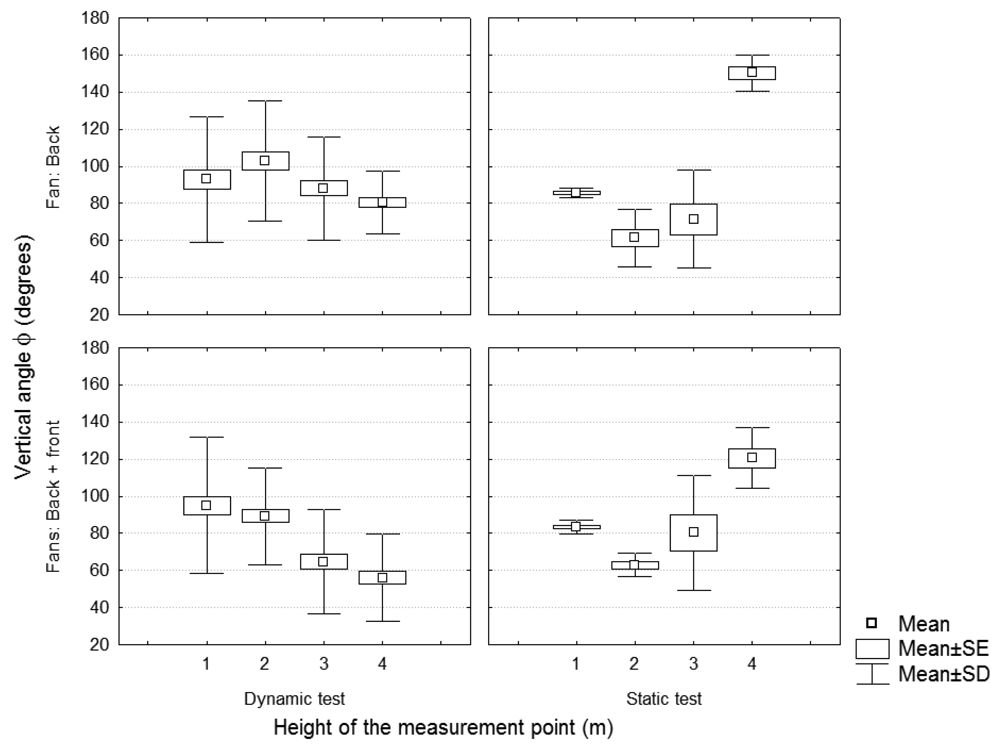 The vertical angles φ of the velocity vector (Figure 16), in the same way as in the static test, were lower when two fans were used.