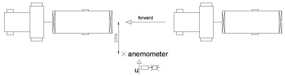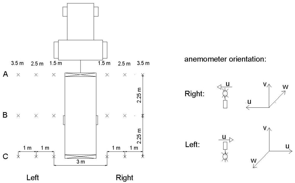 For each measuring point and sprayer setting, data were recorded during 60 s. The anemometer orientation for the measurements is shown in Figure 4.