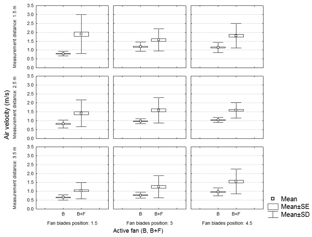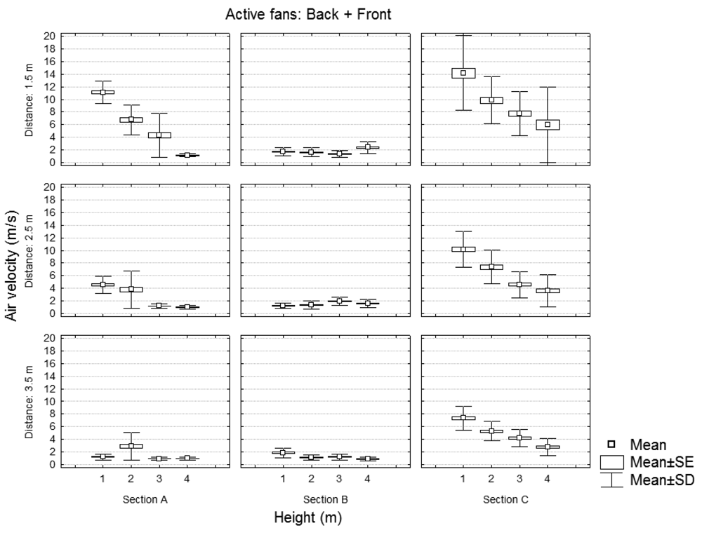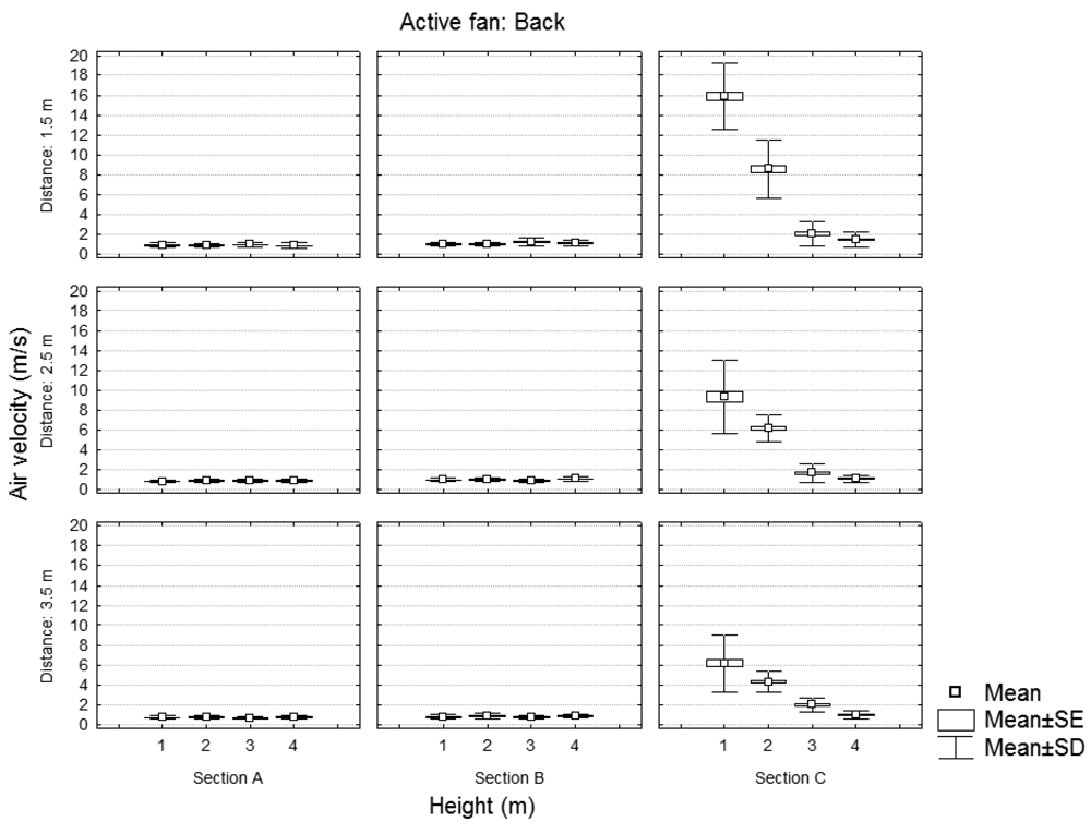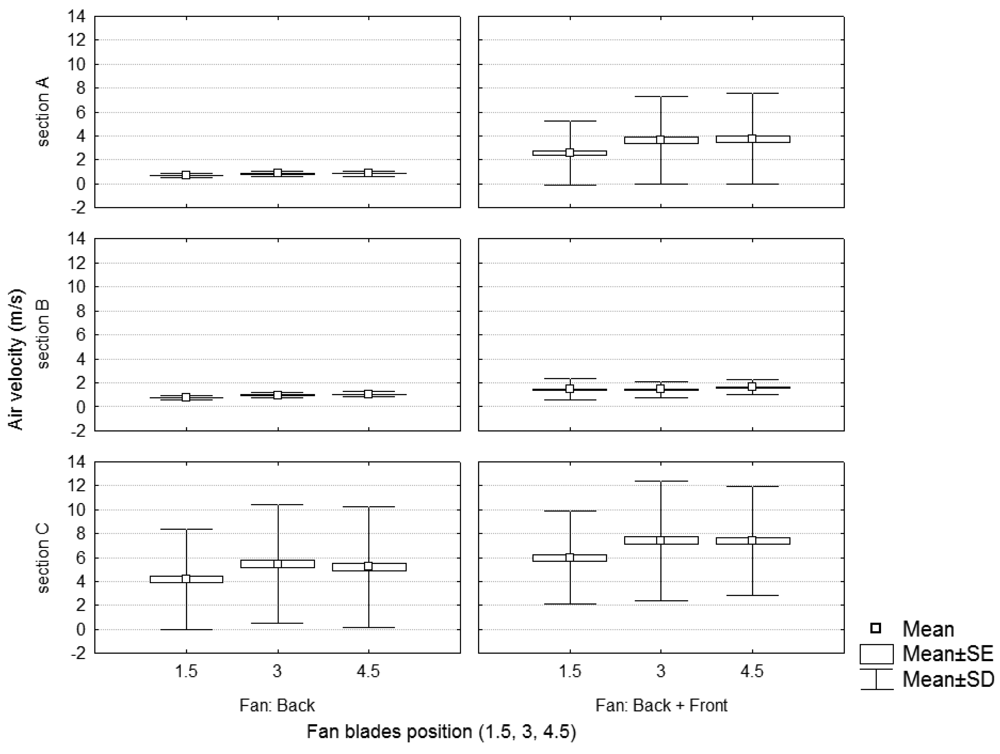The increase in the air velocity in section B reflects the interaction between the air flows generated by both fans more clearly. Figure 9 shows, for any distance, the air velocities recorded in section B were higher in the case of two activated fans.