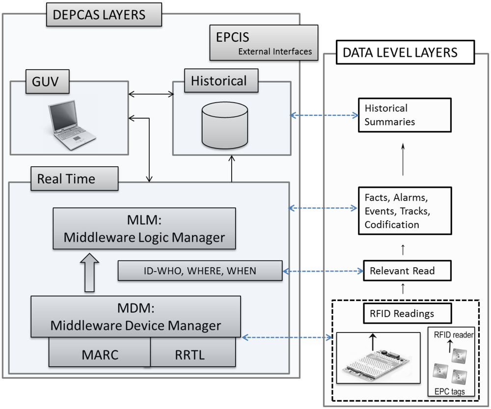 A brief summary of the highlights of DEPCAS is presented in this subsection. The purpose is to show the general block organization of this middleware solution in order to locate the specific part of it which is the main subject of this work. In any case, a major overview of DEPCAS can be found in [7]. DEPCAS is a middleware designed to solve RFID acquisition issues in heterogeneous and real systems, as described in Figure 1. The scheme shown here is based on the architecture of modern SCADA systems.