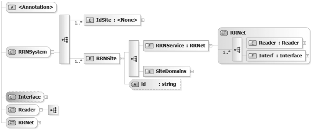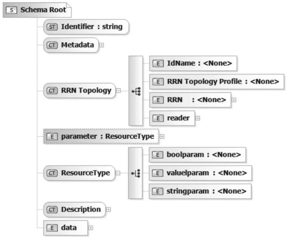 The identifier field is used to identify an RSN implementation. The metadata section element encapsulates some other field to describe the service implementation and its mode of operation. The RRN topology field gives the user a hint about the realized RSN type while the name extends this information and specifies the service in a more precise way. However with the usage of the description field it is possible to describe the application area and domain of the RSN solution. The parameter section holds elements of type valueparam, boolparam or comboparam. The first one allows specifying floating point numbers, the second one logical value selection and the third one represents a list of items. The data block specifies the records that should be provided for the specific network elements. There are several complex types managed inside RRTL schemata. At this point we present the most relevant is the RFID Reader Network (RSN) illustrated in Figure 3.