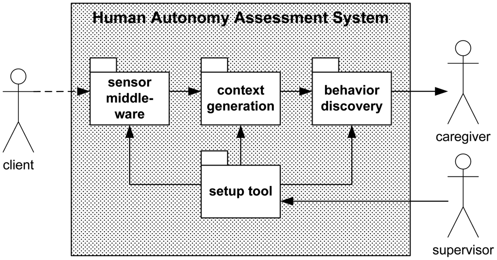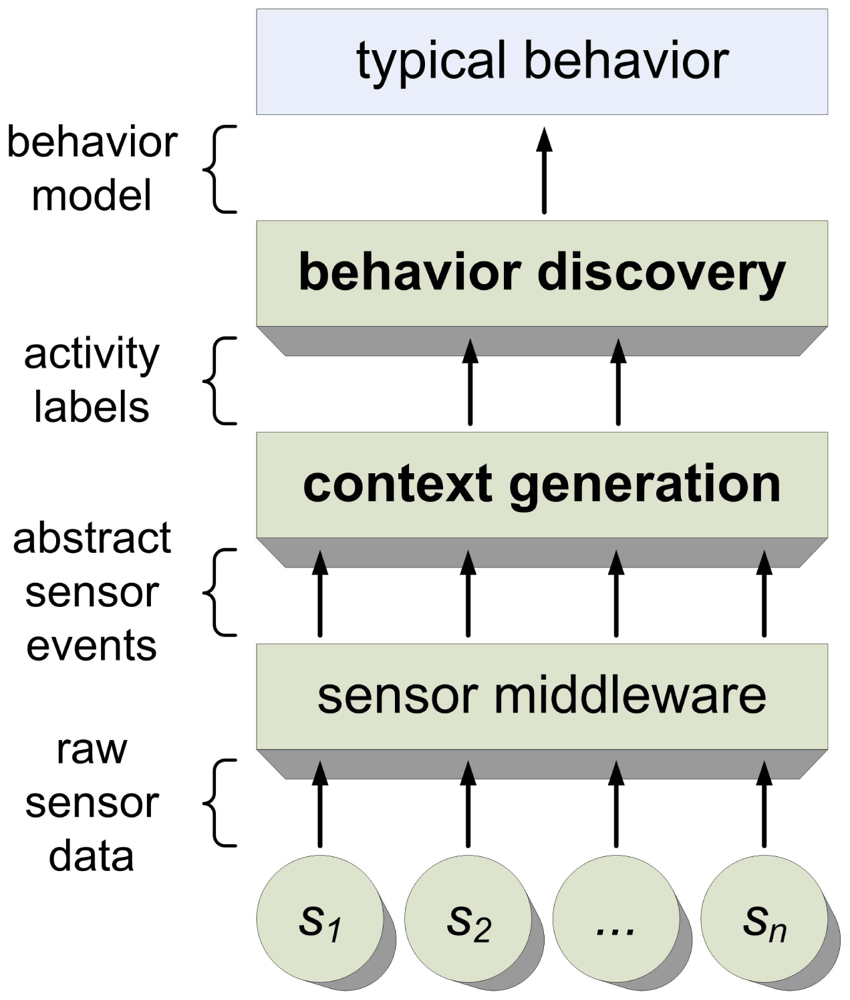 HAAS consists of two main building blocks: context generation and behavior discovery (see Figure 1), which will be considered in this section. The third building block, sensor middleware, is not as unique as the other two. A good overview of promising middleware platforms can be found on this website [28]. Many AAL systems utilize the OSGi framework (e.g., Coronato [29]). Because it is dealt with thoroughly elsewhere, we will explain sensor middleware only briefly and without particular emphasis.