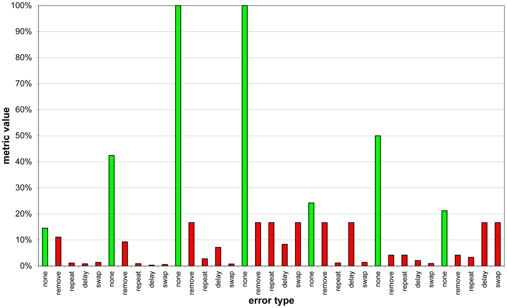 It can easily be seen that if we consider every day individually, the metric value of a normal day (green bar) is always greater than the metric value of every error type for that day (the following four red bars). Taking the whole week into account, at least for the example illustrated by Figure 11, it is impossible to find a threshold that satisfies a perfect classification. Choosing a metric value threshold of around 20% would lead to a precision of roughly 96.5% and a ratio of detected abnormal traces and totality of abnormal traces of 100%.