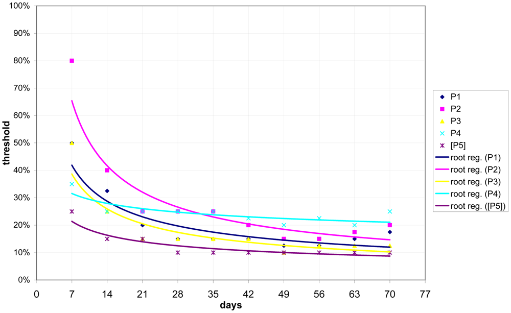 We determined that there is a relation between the time the system has been installed and trained and the optimal threshold. This dependency can best be described by a root function. Figure 12 illustrates this finding. The regression indicates that, during the first couple of days, a threshold of approximately 50% is most appropriate. After roughly six weeks, a threshold between 10% and 20% is more advantageous.