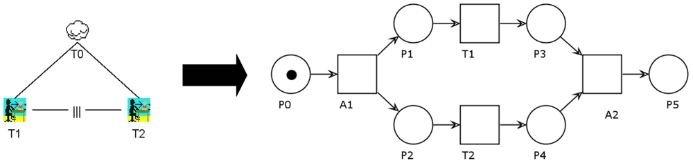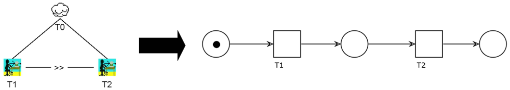 The left side of Figure 3 illustrates two tasks, T1 and T2, which are subtasks of the abstract task T0. T1 and T2 are connected using the sequential enabling-operator, which can be written as T1 ≫ T2. This formula indicates that T1 has to be completed before T2 can start. In order to preserve this semantics, the PN on the right-hand side of Figure 3 inserts a simple place between T1 and T2. When T1 is completed, the token will move to the intermediate place. This guarantees that there is a point in time when T1 has finished before T2 starts. Afterwards, T2 can be executed. Finally, the token arrives at the place on the right.