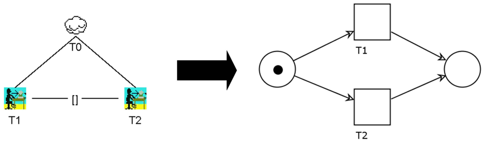 The next transformation rule (see Figure 4) illustrates the choice between T1 and T2, which can also be denoted as T1 [] T2. The semantics behind this formula indicates that, as soon as a choice between T1 and T2 has been made, the other task can no longer be executed. The PN equivalent can be seen on the right side. Both tasks, T1 and T2, are connected by arcs starting at the initial place. The first task executed (i.e., either T1 or T2) will remove the token from that place and move it to the final place. That way, only one task can be performed.