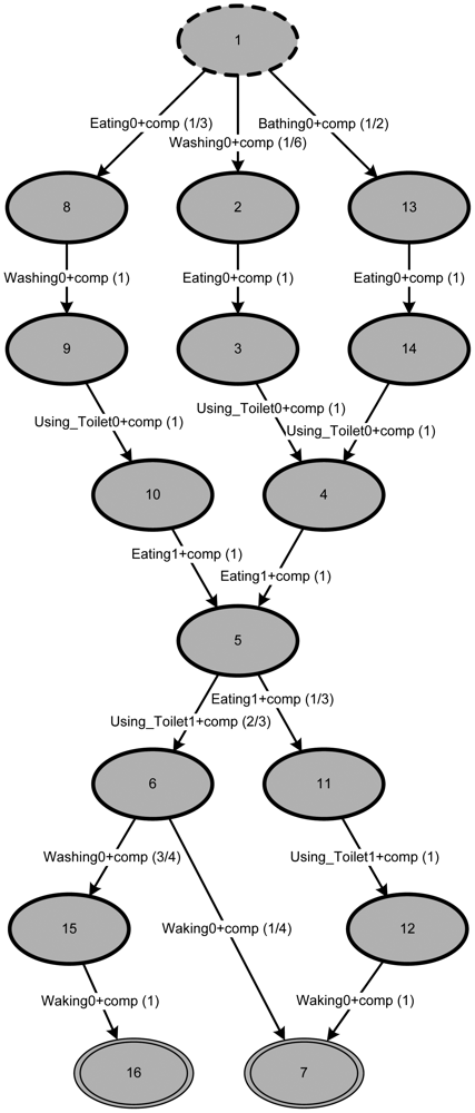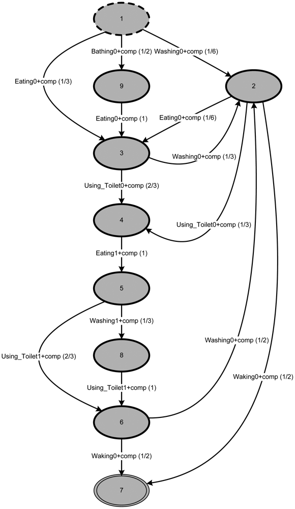 At the beginning of each day (detected using the dedicated “waking/sleeping” activity), every PN is set to its initial marking (state). As soon as a sensor event indicates that part of an ADL is taking place, the appropriate PN will experience progress.