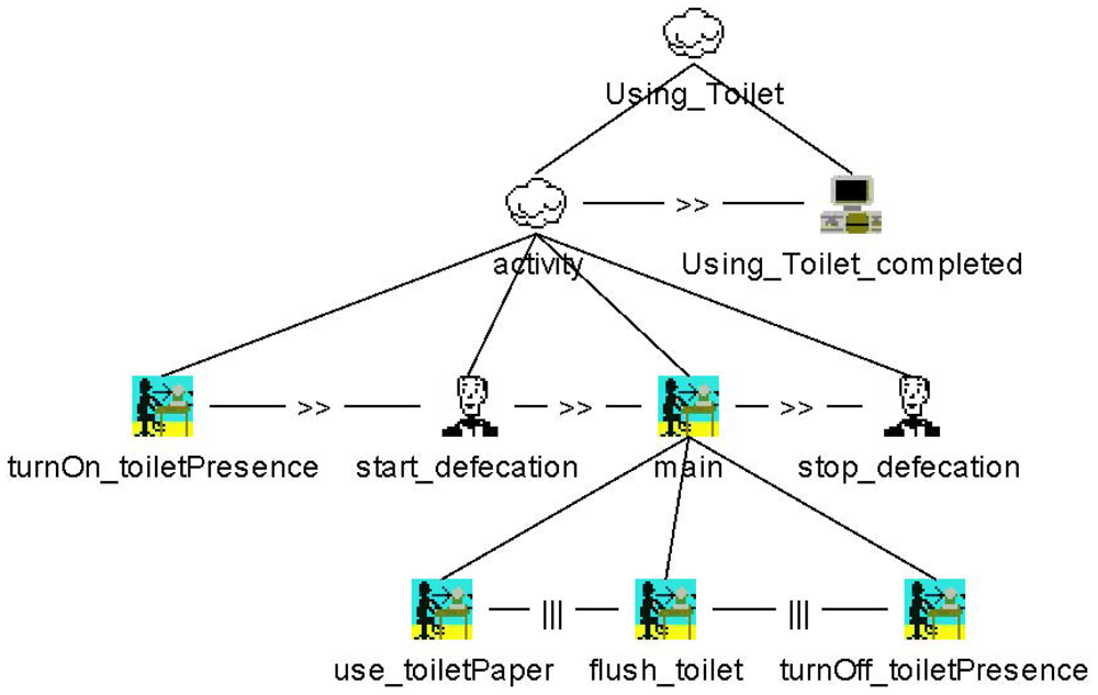 We use Paterno's Concur Task Tree (CTT) notation [31], because it has been shown to be quite intuitive to understand for both caregivers and computer scientists [32]. The reason for its intuitiveness lies in its compact and understandable representation. Nevertheless, it is very powerful and flexible when it comes to modeling temporal ordering and offers a rich set of operators [33]. Moreover, tools for design and simulation are publicly available (e.g., TERESA [34]).