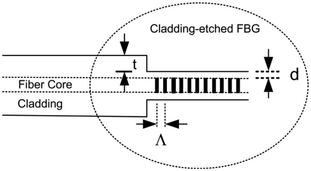 In this paper, a new temperature-compensation method is presented and experimentally demonstrated in which a liquid mixture with a negative thermo-optic coefficient is used as an external coating material of a cladding-etched FBG. Figure 1 shows the structure of the fabricated cladding-etched FBG etched almost to the fiber core to get the 0.3-μm-radius remained cladding (d), 61.2-μm-thickness removed cladding (t), and grating pitch of 535 nm (Λ).
