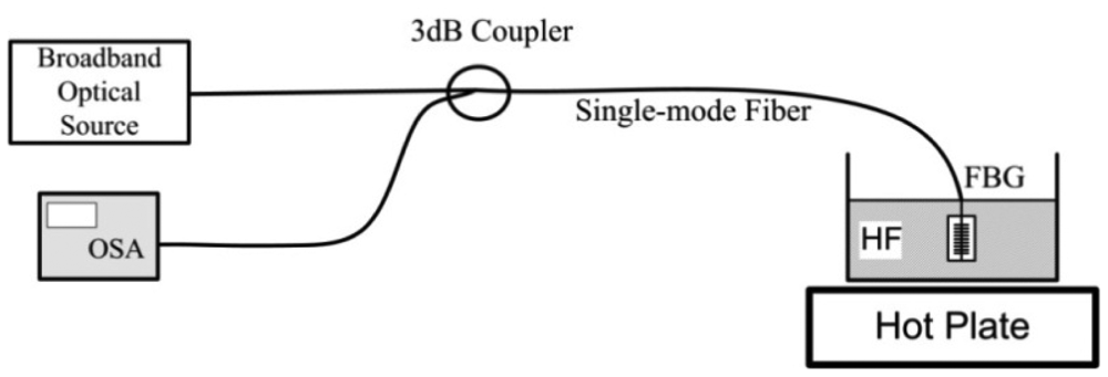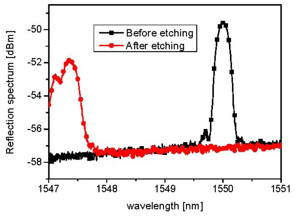 Figure 3 shows the experimental setup for the cladding-etching process in which the spectrum is monitored during and after the etching of an FBG connected to the 3 dB coupler. A broadband optical source (Agilent 83437A) and an optical spectrum analyzer (OSA, Ando, AQ6315A) were used to measure the reflected optical power through the 3 dB coupler. The FBG fiber was immersed and chemically etched in an aqueous solution of hydrofluoric acid (HF 40%) at 60 °C, and the Bragg wavelength shift relative to the initial Bragg wavelength was monitored in real time during the chemical etching process. With the approximate etching rate of 1.1 μm/min, the fiber cladding was etched almost to the fiber core for evanescent wave coupling with an external medium.