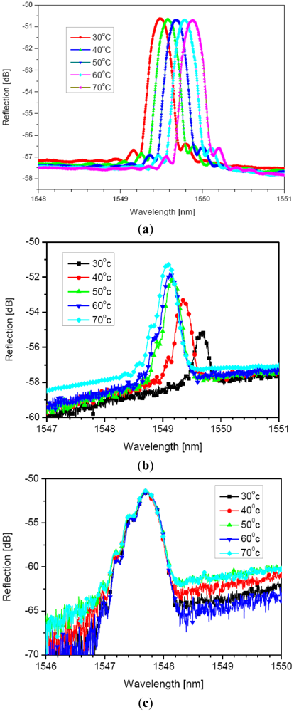 A conventional standard FBG has a well-known temperature sensitivity of 0.01 nm/°C; hence, the non-cladding-etched FBG in Figure 5(a) undergoes a Bragg wavelength of 1,549.5 nm shift to the longer wavelength of 1,549.9 nm when the temperature increases from 30 °C to 70 °C. As shown in Figure 5(b), the Bragg wavelength of 1,549.7 nm of the cladding-etched FBG with the liquid mixture of water (3%) and glycerin (93%) was shifted to a shorter wavelength, which shows a negative thermo-optic effect of the liquid mixture opposite to the positive thermo-optic effect of the standard FBG in Figure 5(a). With the greater thermo-optic effect of the liquid mixture than that of the silica FBG, the Bragg wavelength passed the central wavelength of 1,549.7 nm and shifted to a shorter wavelength. In Figure 5(c), in the liquid mixture of water (50%) and glycerin (50%) with the measured thermo-optic coefficient of −5 × 10−4 °C−1, the Bragg wavelengths of the proposed FBG were almost the same at 1,547.7 nm in the temperature range from 30 °C to 70 °C. Using this result, the Bragg wavelength shift dependent on the surrounding temperature can be avoided by the liquid mixture with a negative thermo-optic coefficient.