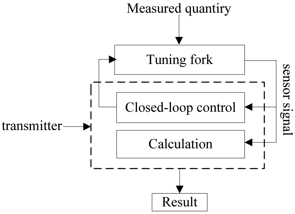 The sensor is composed of the sensitive unit and the closed-loop control unit, where the sensitive unit consists of the actuator, the resonant tuning fork and the detector. Resonant tuning fork senses the liquid density directly, and the detector sends the signal which carries measurement information forward to the closed-loop control unit for processing and output density value, while the closed-loop control unit output excitation signal to control the actuator and then drive the tuning fork. The basic configuration of the sensor is shown in Figure 1.