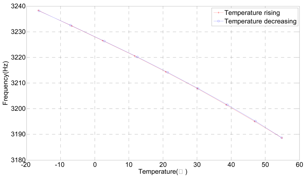 Figure 10 shows that the natural frequency of the tuning fork changes with the temperature, thus, a temperature sensor is required in order to compensate for the changes in the elastic modulus of the tuning fork in real-time. The experiment result is identical with theoretical analysis provided above, which proves that the theoretical results are reliable.