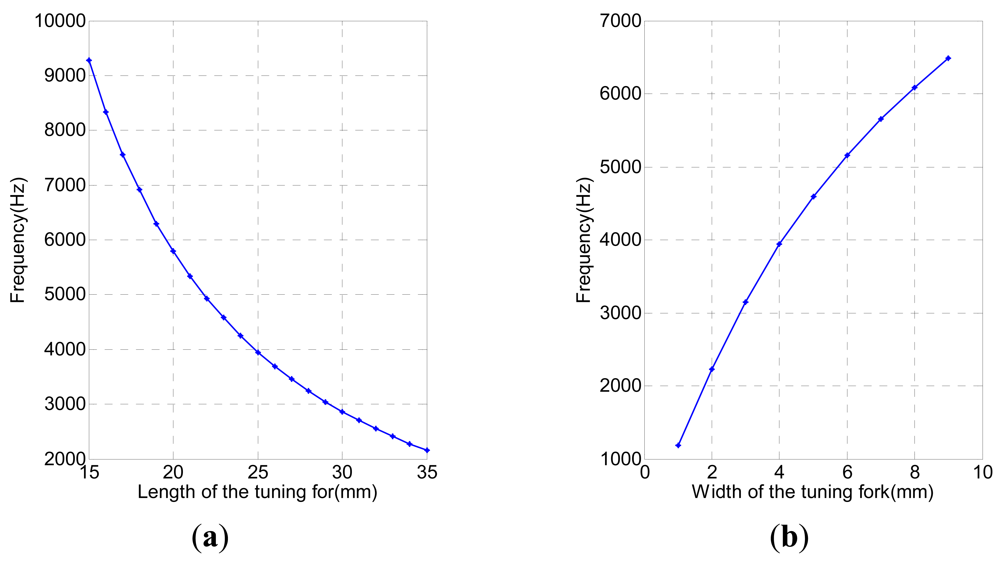 Figure 4 shows how the first-order natural frequency of the tuning fork decreases as the length increases, and increases as the width increases. First we maintain the width invariable (4 mm) and change the length (15∼35 mm), giving the curve shown in Figure 4(a) that relates the change of natural frequency with the length. Then we maintain the length (12 mm) as a constant and change the width (1∼9 mm), and in this case the curve that shows the resulting change of natural frequency with the width is as indicated by Figure 4(b). The simulation result is identical with that of the theoretical analysis. Therefore, structural parameters must be taken into account when designing the sensor.