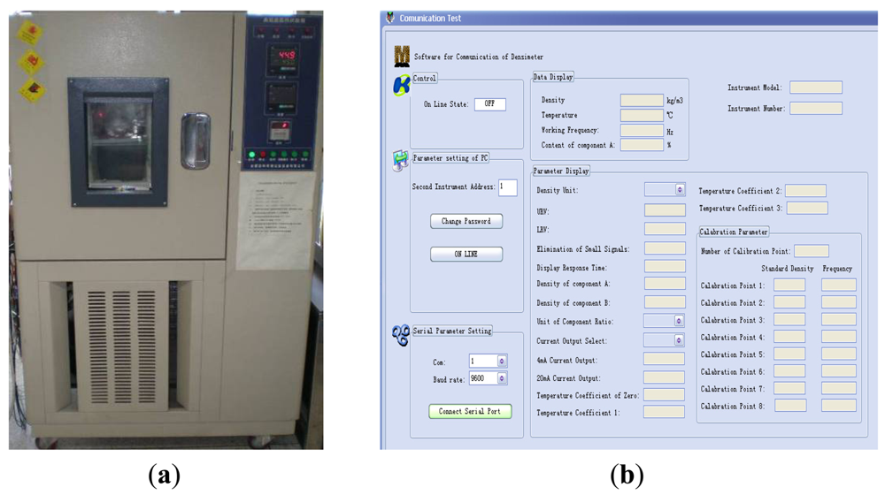 Temperature experiments were performed to check the impact of this factor on the natural frequency. The temperature environment is provided by a GDS-50L type temperature controller with accuracy of ±0.1 °C. Natural frequencies of the tuning fork are obtained through the homemade software once every 10 °C from −20 °C to 60 °C first, and then from 60 °C to −20 °C. The experimental set-up and the software interface are shown in Figure 9.