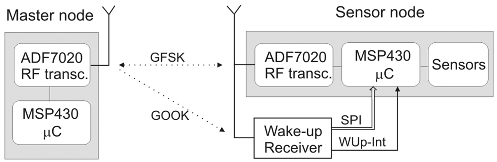 A typical deployment of a dedicated WUR in a wireless sensor would be as an additional circuit to an existing wireless transceiver. It should communicate with the sensor's microcontroller via some standard interface, and ideally re-use the transceiver's antenna and the communication frequency dedicated to the WBAN. A typical application will be in a WBAN network with ranges less than 2 m. There will be a dedicated device acting as a Master Node that will act as a network coordinator. This device would send wake up signals, and receive data packets from sensors.