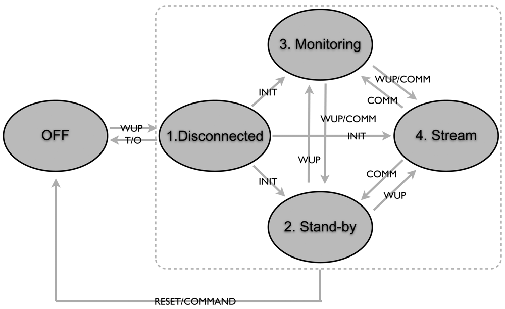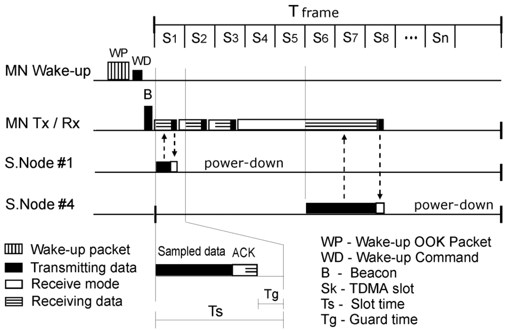 Stand-by—The sensor is in a deep sleep mode, but is paired with a MN, waiting for a wake-up signal to change its state, to get assigned to a channel.